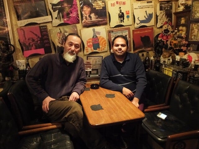 Een must see, al zie je op deze foto bitter weinig. Ik kon helaas geen betere vinden. De eigenaar staat er wel op. Dat is geen toeval. Voor hem was ik gewaarschuwd. De zaak heet niet helemaal voor niks Samurai. Vervaarlijke gast. Art Farmer blies.